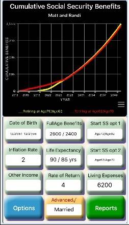 The answer depends on how long you plan on working, marital status, life expectancy, inflation and other factors. Married couples may also want to analyze break-even age points for optimizing cumulative benefits. A careful analysis is needed to make an informed once-in-a-lifetime decision. This app can help you evaluate such important factors and analyze your options.