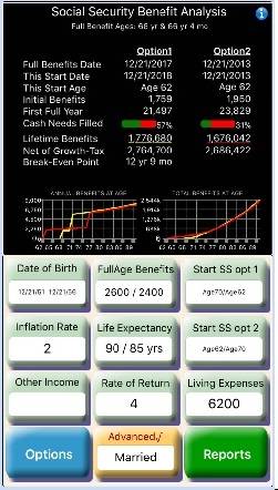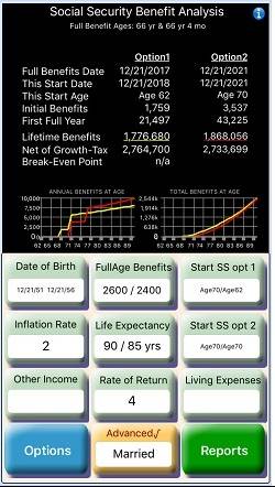 The answer depends on how long you plan on working, marital status, life expectancy, inflation and other factors. Married couples may also want to analyze break-even age points for optimizing cumulative benefits. A careful analysis is needed to make an informed once-in-a-lifetime decision. This app can help you evaluate such important factors and analyze your options.